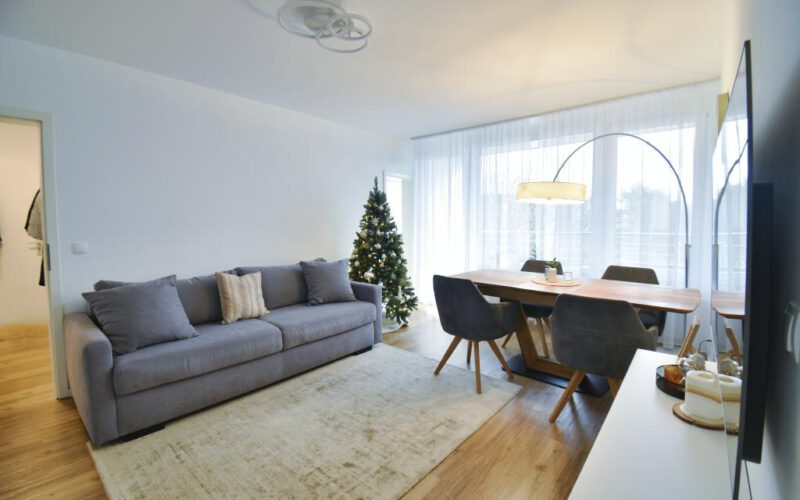 Der großzügige Wohnbereich bildet das Herzstück der Wohnung und bietet direkten Zugang zum Balkon, der zu entspannten Stunden im Freien einlädt. Große Fensterflächen sorgen für eine helle und freundliche Wohnatmosphäre.