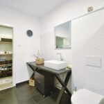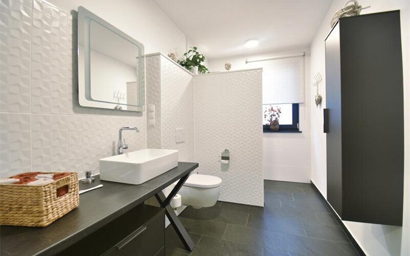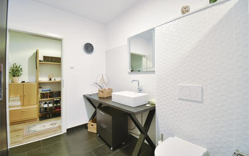 Eines der Badezimmer ist mit einer Badewanne ausgestattet und bietet einen direkten Zugang zur Terrasse – ein besonderes Highlight, das Wellness- und Komfortgefühl auf ein neues Niveau hebt. Hochwertige Sanitärobjekte und zeitgemäßes Design schaffen eine elegante Wohlfühlatmosphäre.